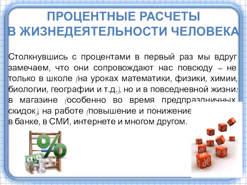умение выполнять процентные вычисления и расчеты необходимо каждому человеку, так как с процентами мы сталкиваемся повседневной жизни постоянно.