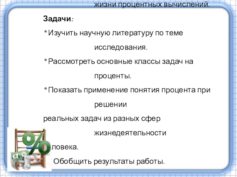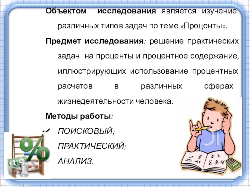 Слайд 6Объектом исследования является изучение различных типов задач по теме «Проценты».
