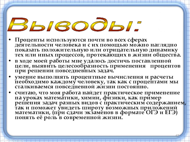 в ходе моей работы мне удалось достичь поставленной цели, выявить целесообразность применения процентов при решении повседневных задач.