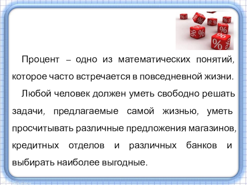 Слайд 4Процент – одно из математических понятий, которое часто встречается в повседневной