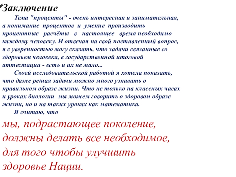 умение производить процентные расчёты в настоящее время необходимо каждому человеку. И отвечая на свой поставленный вопрос, я с уверенностью могу сказать, что задачи связанные со здоровьем человека, в государственной итоговой аттестации - есть и их не мало...