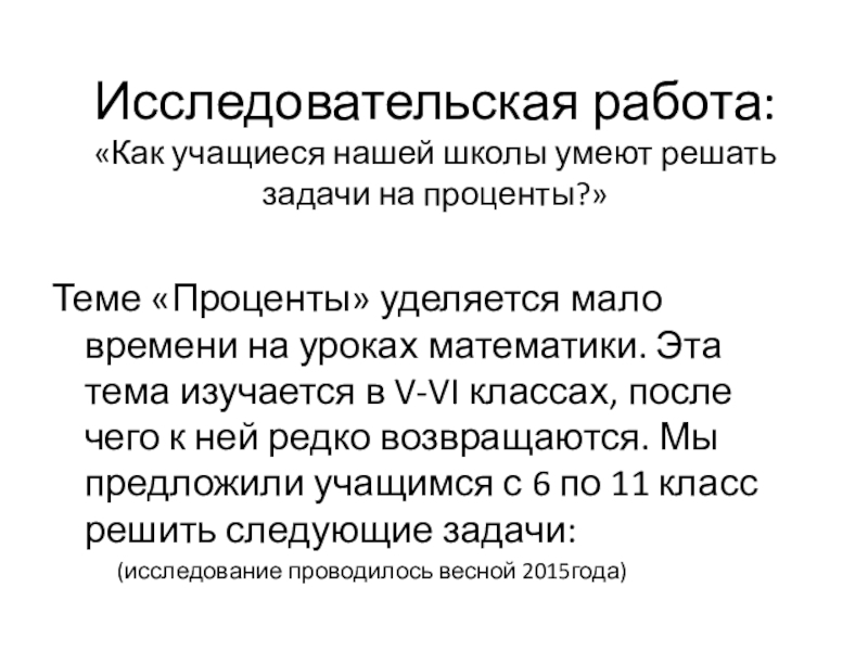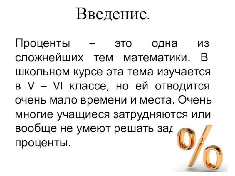 эта тема изучается в V – VI классе, но ей отводится очень мало времени и места. Очень многие учащиеся затрудняются или вообще не умеют решать задачи на проценты.