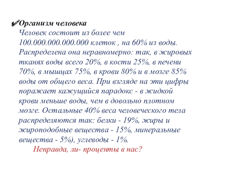 из воды. Распределена она неравномерно: так, в жировых тканях воды всего 20%, в кости 25%, в печени 70%, в мышцах 75%, в крови 80% и в мозге 85% воды от общего веса. При взгляде на эти цифры поражает кажущийся парадокс - в жидкой крови меньше воды, чем в довольно плотном мозге. Остальные 40% веса человеческого тела распределяются так: белки - 19%, жиры и жироподобные вещества - 15%, минеральные вещества - 5%), углеводы - 1%.