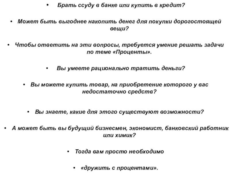 Любой человек должен уметь свободно решать задачи, предлагаемые самой жизнью, уметь просчитывать различные предложения магазинов, кредитных отделов и различных банков и выбирать наиболее выгодные.