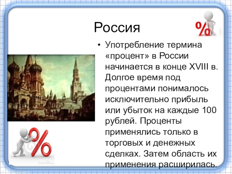 Употребление термина «процент» в России начинается в конце XVIII в. Долгое