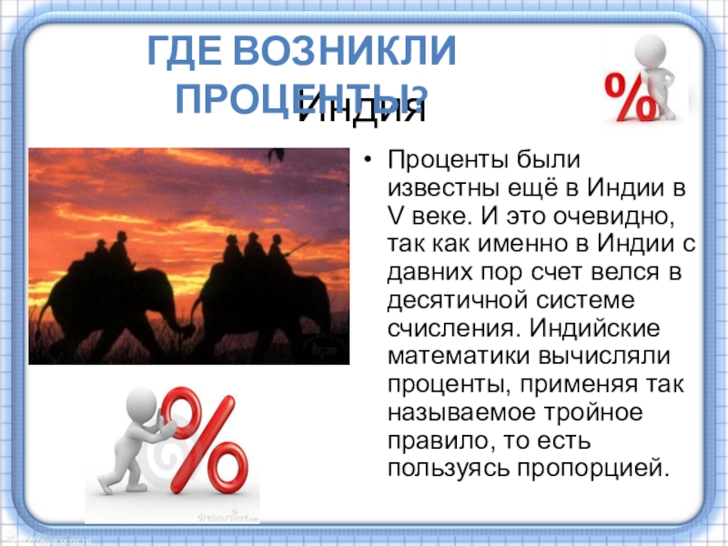 очевидно, так как именно в Индии с давних пор счет велся в десятичной системе счисления. Индийские математики вычисляли проценты, применяя так называемое тройное правило, то есть пользуясь пропорцией.