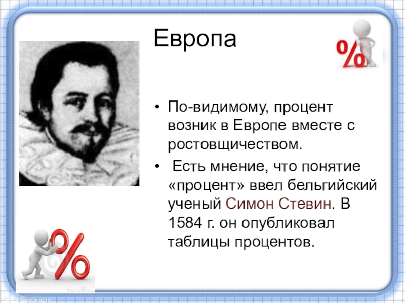 понятие «процент» ввел бельгийский ученый Симон Стевин. В 1584 г. он опубликовал таблицы процентов.