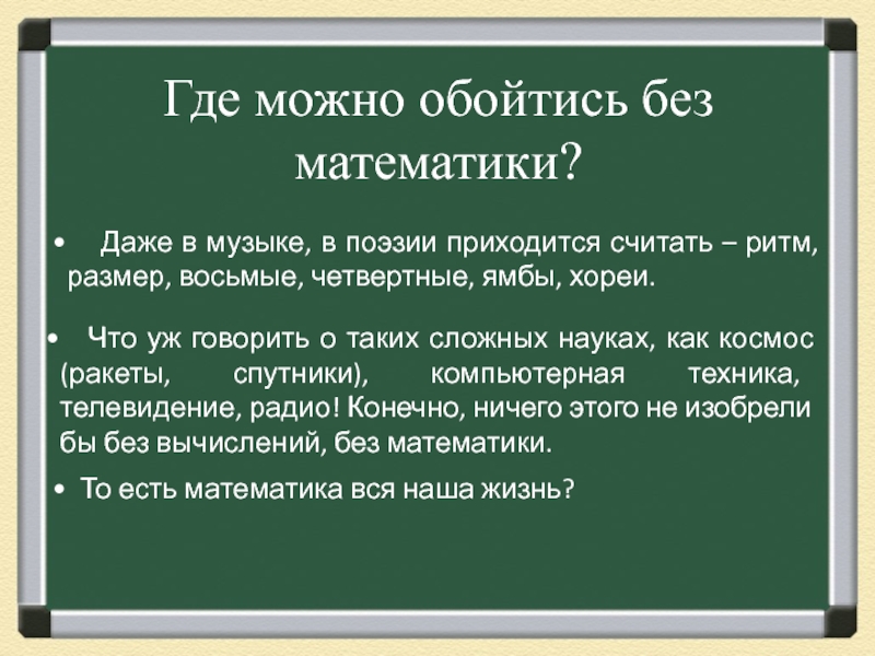 Что уж говорить о таких сложных науках, как космос (ракеты, спутники), компьютерная техника, телевидение, радио! Конечно, ничего этого не изобрели бы без вычислений, без математики.