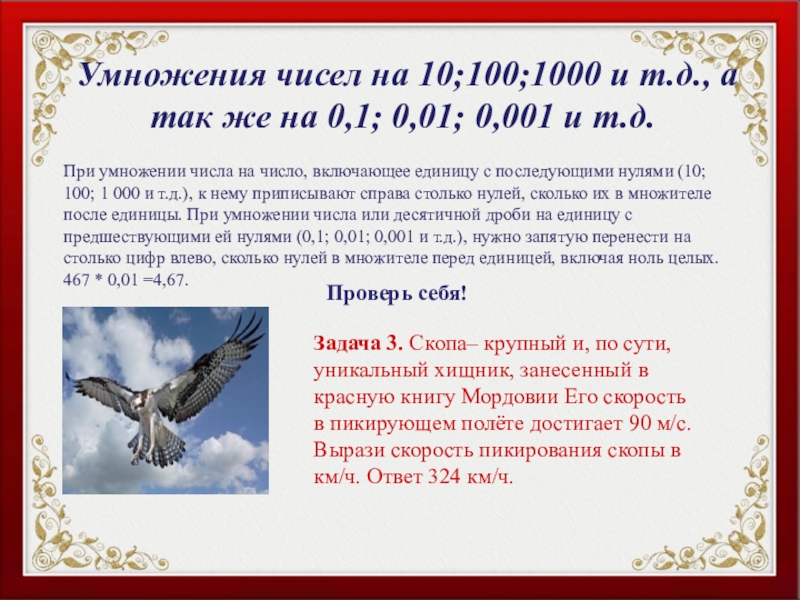 Задача 3. Скопа– крупный и, по сути, уникальный хищник, занесенный в красную книгу Мордовии Его скорость в пикирующем полёте достигает 90 м/с. Вырази скорость пикирования скопы в км/ч. Ответ 324 км/ч.