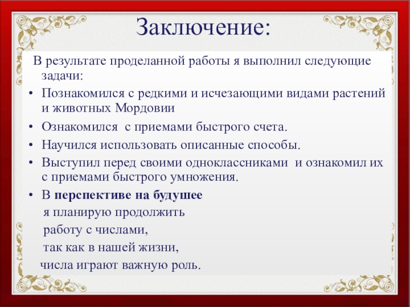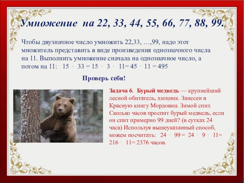 Задача 6. Бурый медведь — крупнейший лесной обитатель, хищник. Занесен в Красную книгу Мордовии. Зимой спит. Сколько часов проспит бурый медведь, если он спит примерно 99 дней? (в сутках 24 часа) Используя вышеуказанный способ, можем посчитать: 24 99 = 24 9 11= 216 11= 2376 часов.