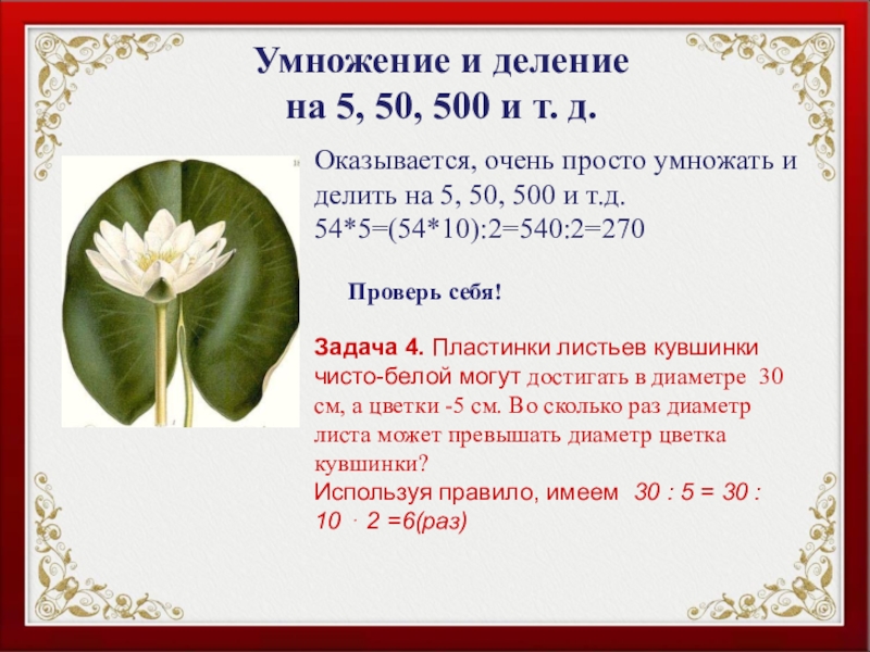 Задача 4. Пластинки листьев кувшинки чисто-белой могут достигать в диаметре 30 см, а цветки -5 см. Во сколько раз диаметр листа может превышать диаметр цветка кувшинки?