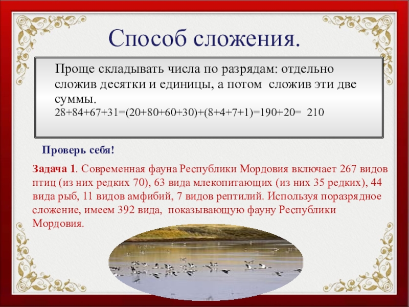 Задача 1. Современная фауна Республики Мордовия включает 267 видов птиц (из них редких 70), 63 вида млекопитающих (из них 35 редких), 44 вида рыб, 11 видов амфибий, 7 видов рептилий. Используя поразрядное сложение, имеем 392 вида, показывающую фауну Республики Мордовия.