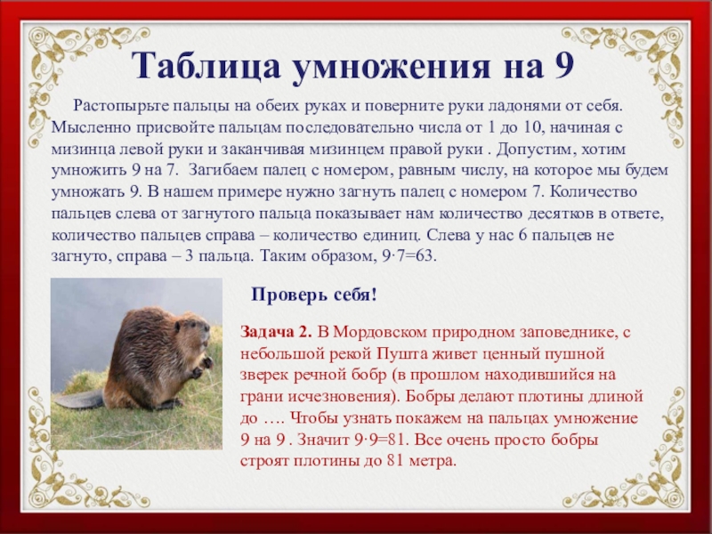 Задача 2. В Мордовском природном заповеднике, с небольшой рекой Пушта живет ценный пушной зверек речной бобр (в прошлом находившийся на грани исчезновения). Бобры делают плотины длиной до …. Чтобы узнать покажем на пальцах умножение 9 на 9 . Значит 9·9=81. Все очень просто бобры строят плотины до 81 метра.