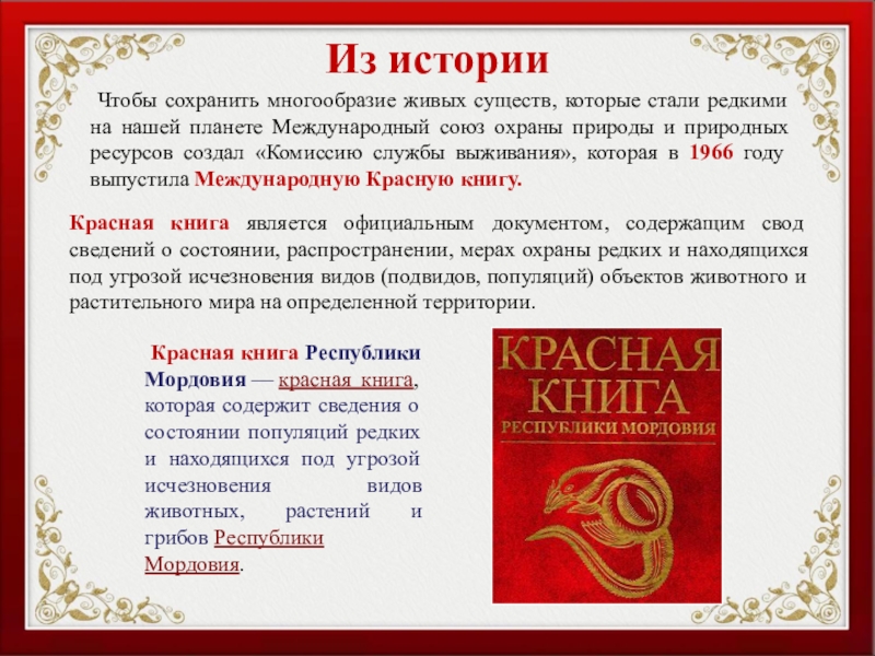 Красная книга является официальным документом, содержащим свод сведений о состоянии, распространении, мерах охраны редких и находящихся под угрозой исчезновения видов (подвидов, популяций) объектов животного и растительного мира на определенной территории.