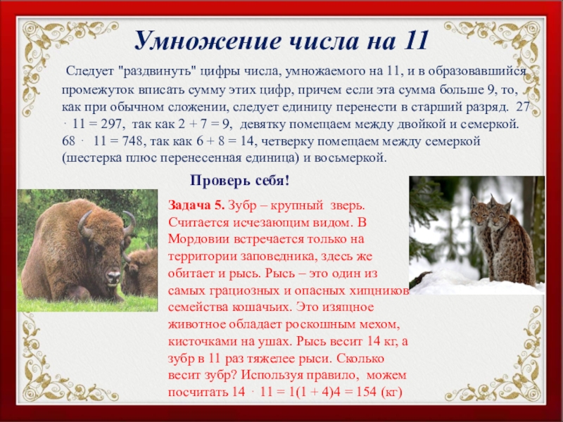 Задача 5. Зубр – крупный зверь. Считается исчезающим видом. В Мордовии встречается только на территории заповедника, здесь же обитает и рысь. Рысь – это один из самых грациозных и опасных хищников семейства кошачьих. Это изящное животное обладает роскошным мехом, кисточками на ушах. Рысь весит 14 кг, а зубр в 11 раз тяжелее рыси. Сколько весит зубр? Используя правило, можем посчитать 14 11 = 1(1 + 4)4 = 154 (кг)