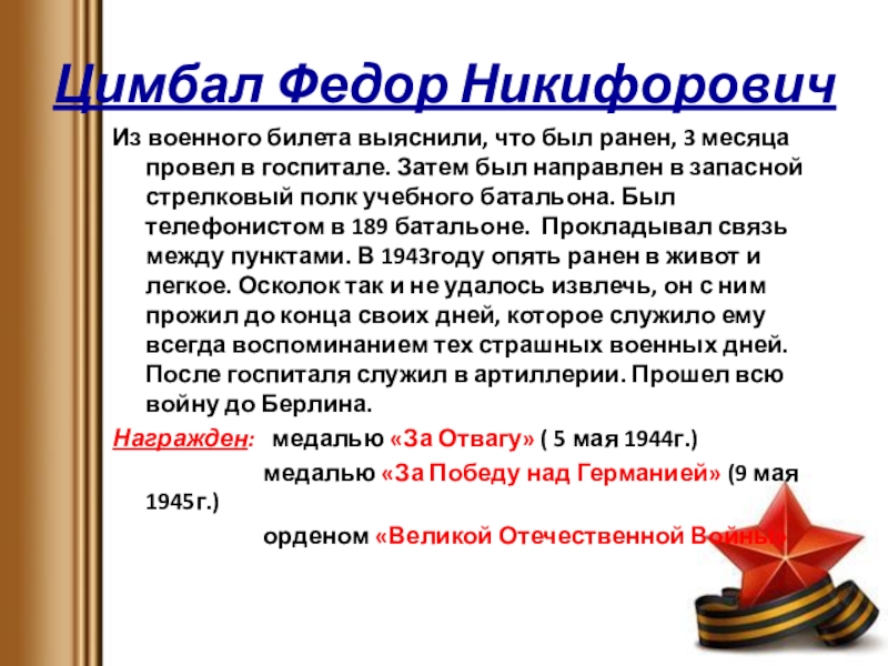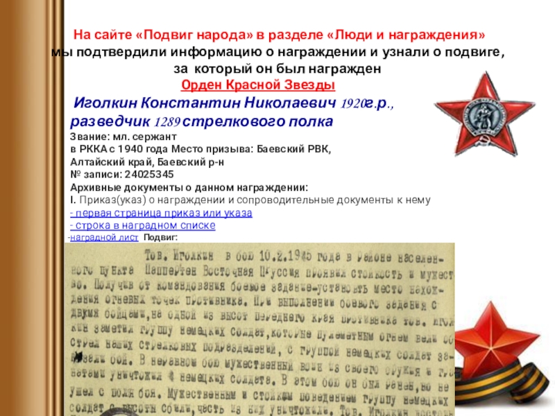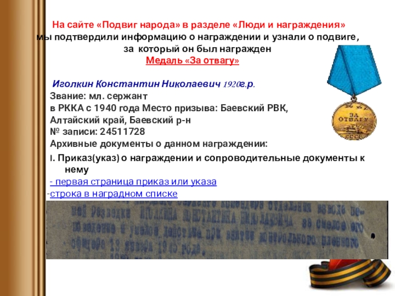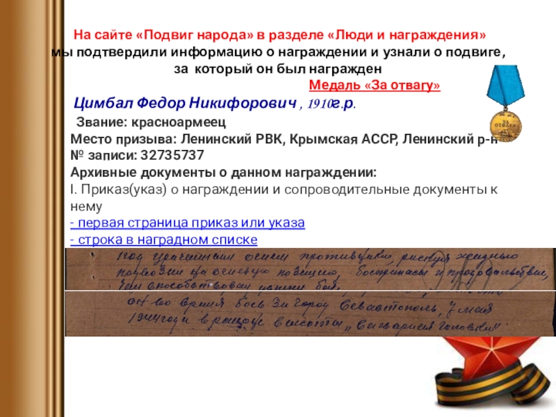 Орденской книжки о награждениях, но мы продолжим поиск информации и сбор материала в дальнейшем исследовании