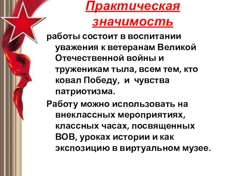 Работу можно использовать на внеклассных мероприятиях, классных часах, посвященных ВОВ, уроках истории и как экспозицию в виртуальном музее.