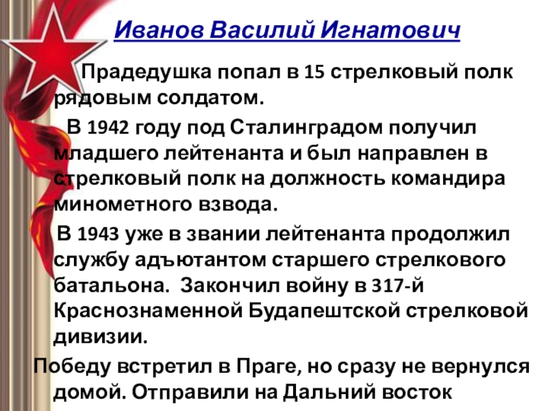 Победу встретил в Праге, но сразу не вернулся домой. Отправили на Дальний восток воевать с японцами.