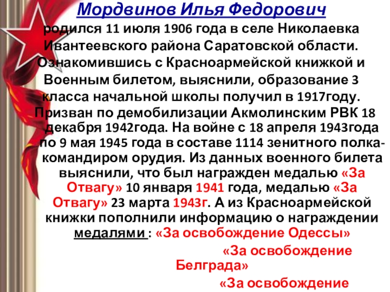 района Саратовской области. Ознакомившись с Красноармейской книжкой и Военным билетом, выяснили, образование 3 класса начальной школы получил в 1917году.
