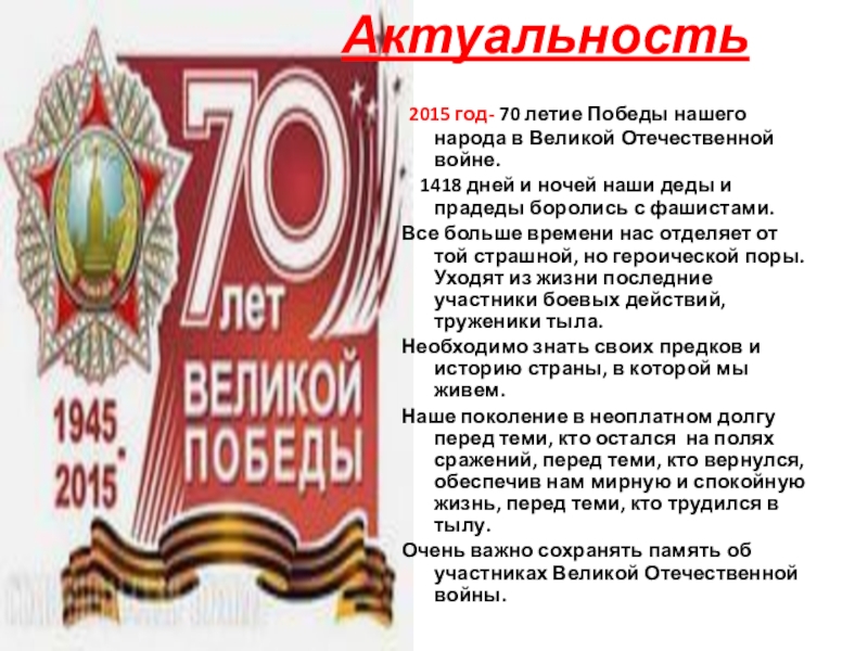 2015 год- 70 летие Победы нашего народа в Великой Отечественной войне.