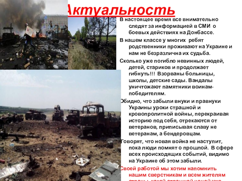 Своей работой мы хотим напомнить нашим сверстникам и всем жителям страны, какой страшной ценой уже был завоеван мир:
