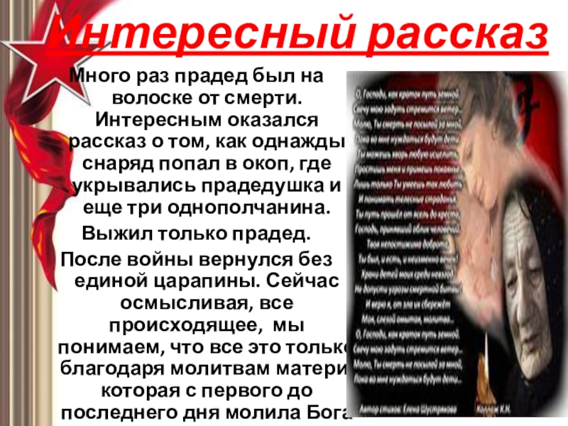 После войны вернулся без единой царапины. Сейчас осмысливая, все происходящее, мы понимаем, что все это только благодаря молитвам матери, которая с первого до последнего дня молила Бога спасти и сохранить ее сына.