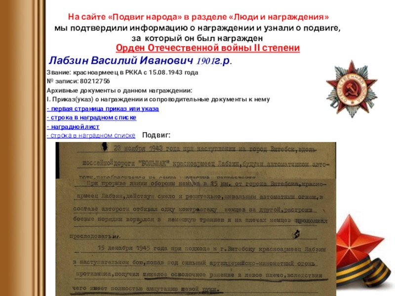 Слайд 42 На сайте «Подвиг народа» в разделе «Люди и награждения»