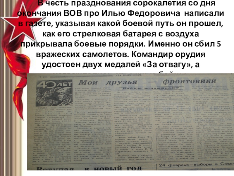 окончания ВОВ про Илью Федоровича написали в газете, указывая какой боевой путь он прошел, как его стрелковая батарея с воздуха прикрывала боевые порядки. Именно он сбил 5 вражеских самолетов. Командир орудия удостоен двух медалей «За отвагу», а награждались отважные бойцы.