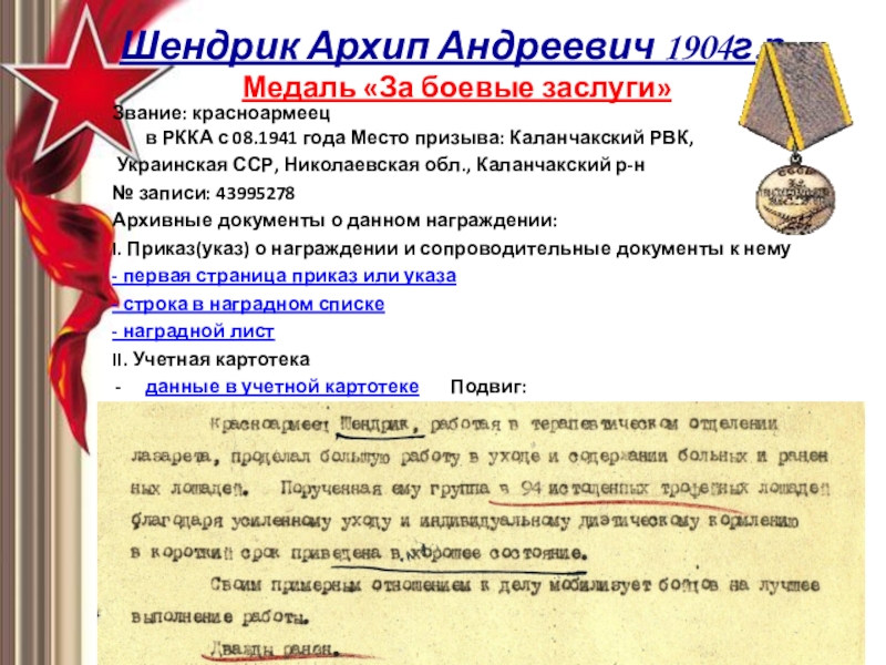 в РККА с 16.08.1941 года Место призыва: Песчанский РВК, Украинская ССР, Винницкая обл., Песчанский р-н № записи: 16193290