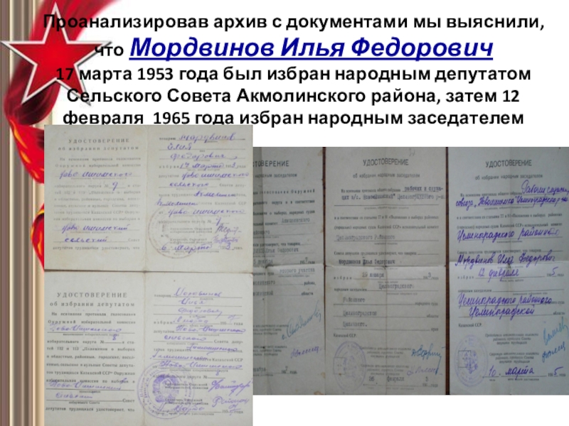 Слайд 30Проанализировав архив с документами мы выяснили, что Мордвинов Илья Федорович
