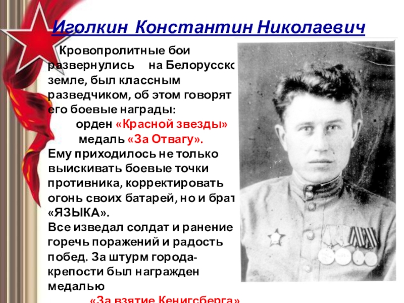 на Белорусской земле, был классным разведчиком, об этом говорят его боевые награды: