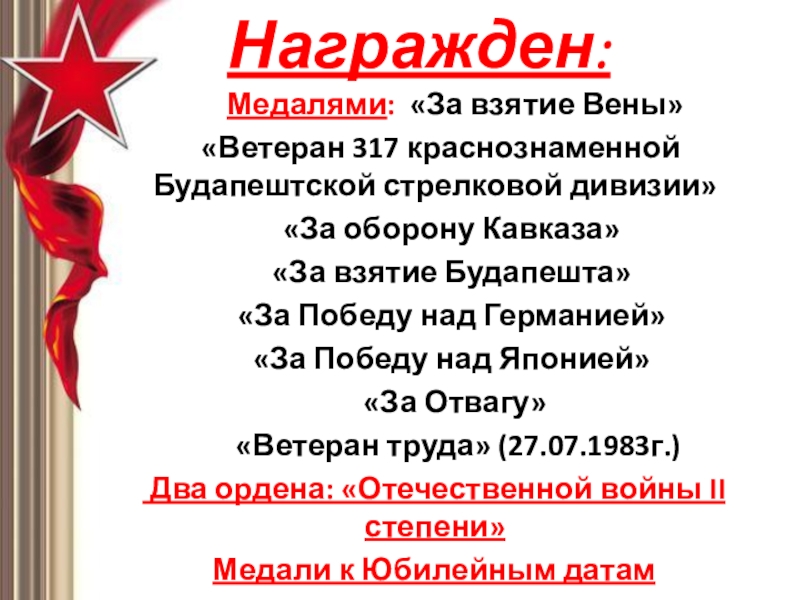 В 1983 году вручена медаль «Ветеран труда», вручались почетные грамоты к юбилейным датам. Воспитали прадедушка с прабабушкой троих детей, дождались внуков. К сожалению , уже прадедушки нет 25 лет, но я им очень горжусь, и благодарна родственникам, за то, что сохранили реликвии военных лет.