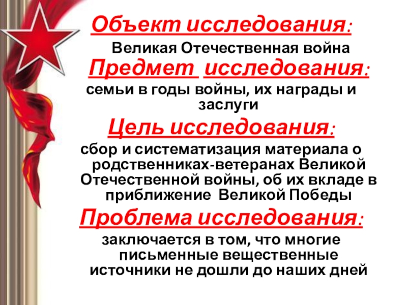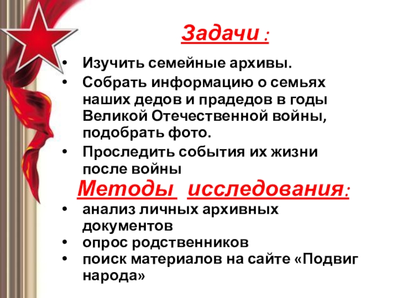 сбор и систематизация материала о родственниках-ветеранах Великой Отечественной войны, об их вкладе в приближение Великой Победы