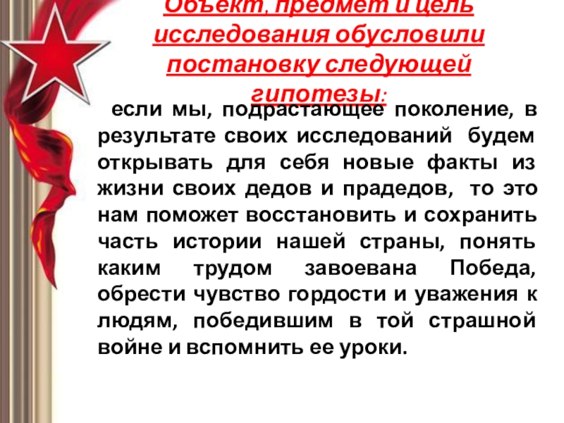 Слайд 5Объект, предмет и цель исследования обусловили постановку следующей гипотезы: