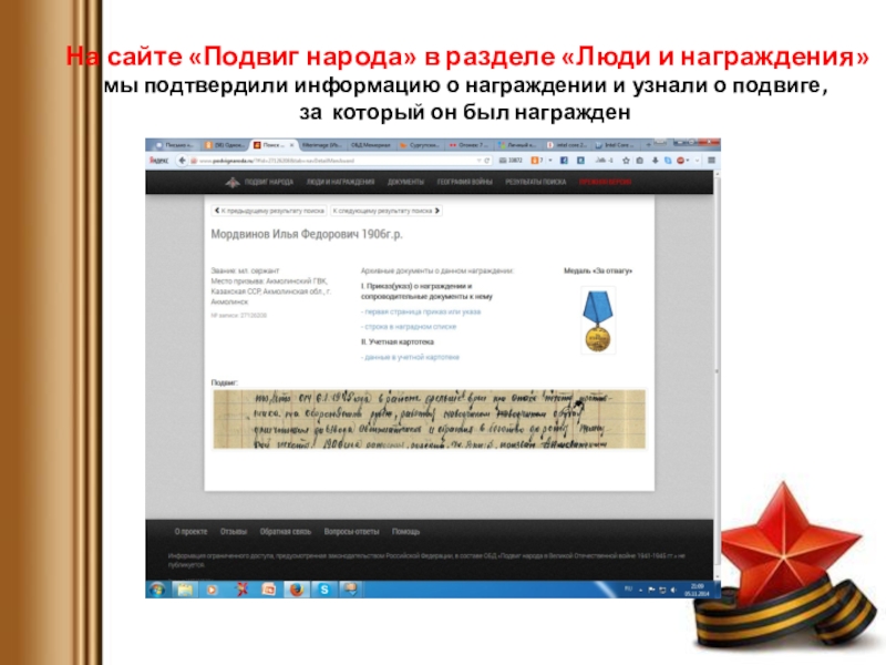 Слайд 21 На сайте «Подвиг народа» в разделе «Люди и награждения»