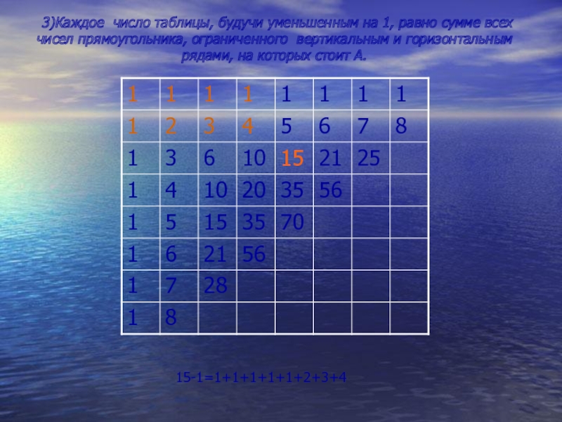 Слайд 103)Каждое число таблицы, будучи уменьшенным на 1, равно сумме всех чисел