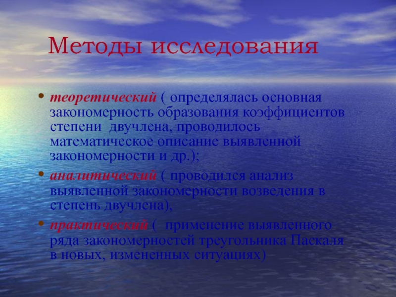 теоретический ( определялась основная закономерность образования коэффициентов степени двучлена, проводилось