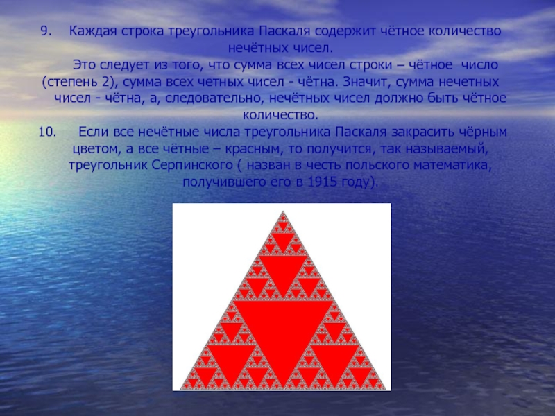 10. Если все нечётные числа треугольника Паскаля закрасить чёрным цветом, а все чётные – красным, то получится, так называемый, треугольник Серпинского ( назван в честь польского математика, получившего его в 1915 году).