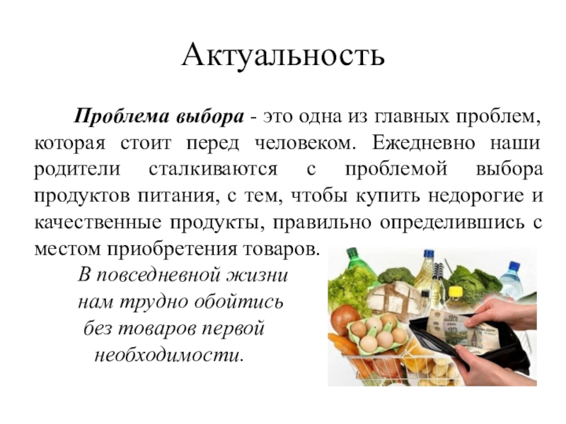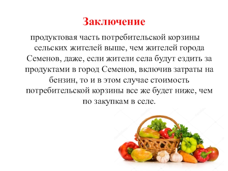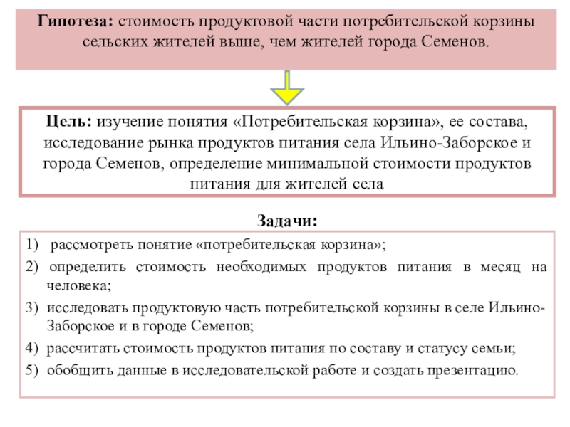 Цель: изучение понятия «Потребительская корзина», ее состава, исследование рынка продуктов питания села Ильино-Заборское и города Семенов, определение минимальной стоимости продуктов питания для жителей села
