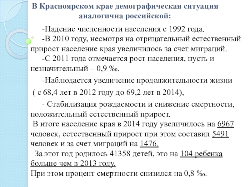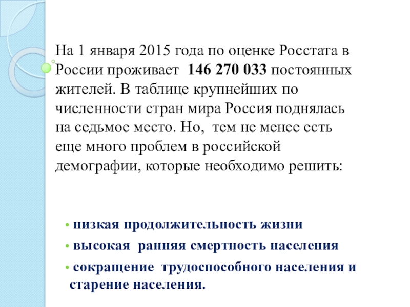На 1 января 2015 года по оценке Росстата в России проживает 146 270 033 постоянных жителей. В таблице крупнейших по численности стран мира Россия поднялась на седьмое место. Но, тем не менее есть еще много проблем в российской демографии, которые необходимо решить: