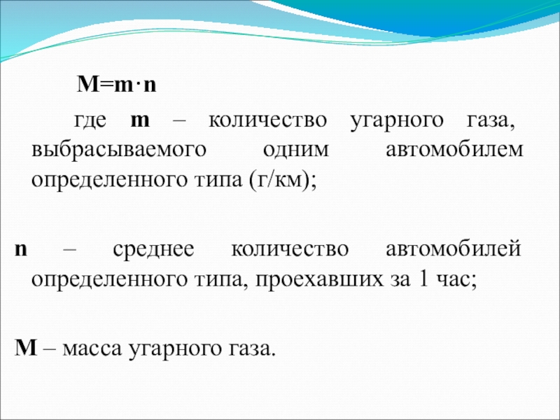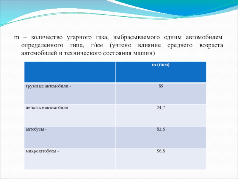 Слайд 9m – количество угарного газа, выбрасываемого одним автомобилем определенного типа, г/км