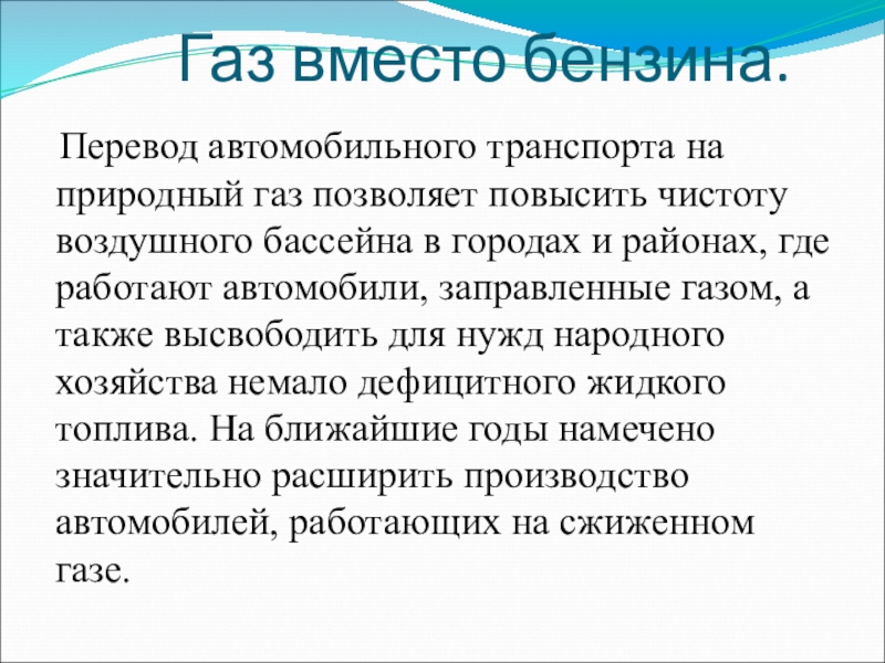 позволяет повысить чистоту воздушного бассейна в городах и районах, где работают автомобили, заправленные газом, а также высвободить для нужд народного хозяйства немало дефицитного жидкого топлива. На ближайшие годы намечено значительно расширить производство автомобилей, работающих на сжиженном газе.