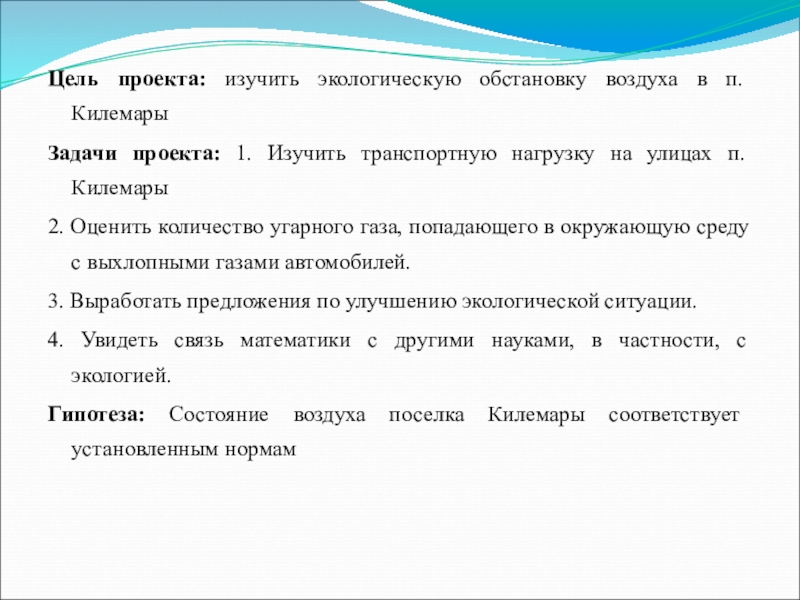 Слайд 3Цель проекта: изучить экологическую обстановку воздуха в п. Килемары