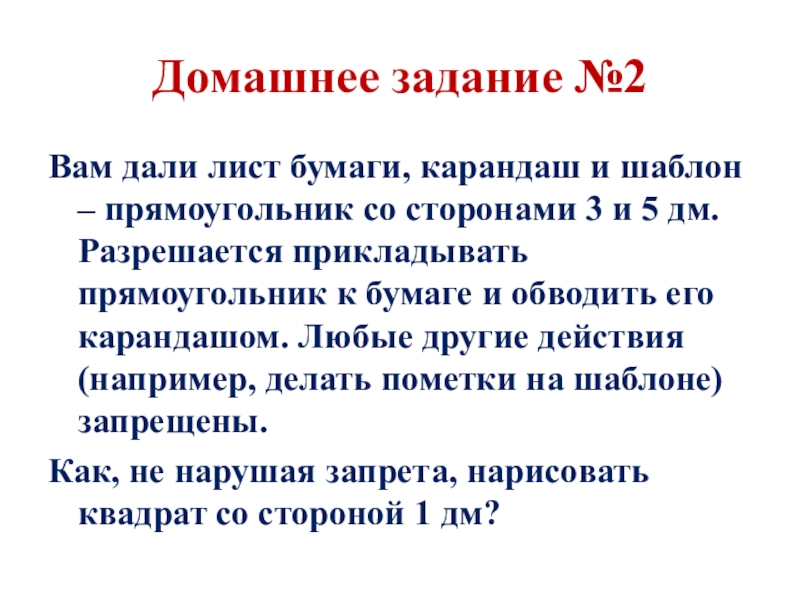 со сторонами 3 и 5 дм. Разрешается прикладывать прямоугольник к бумаге и обводить его карандашом. Любые другие действия (например, делать пометки на шаблоне) запрещены.