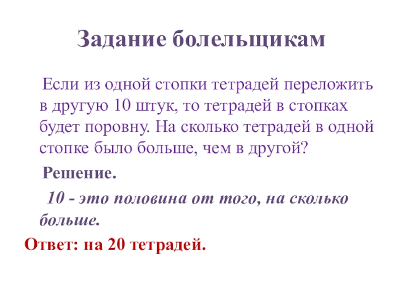 10 штук, то тетрадей в стопках будет поровну. На сколько тетрадей в одной стопке было больше, чем в другой?