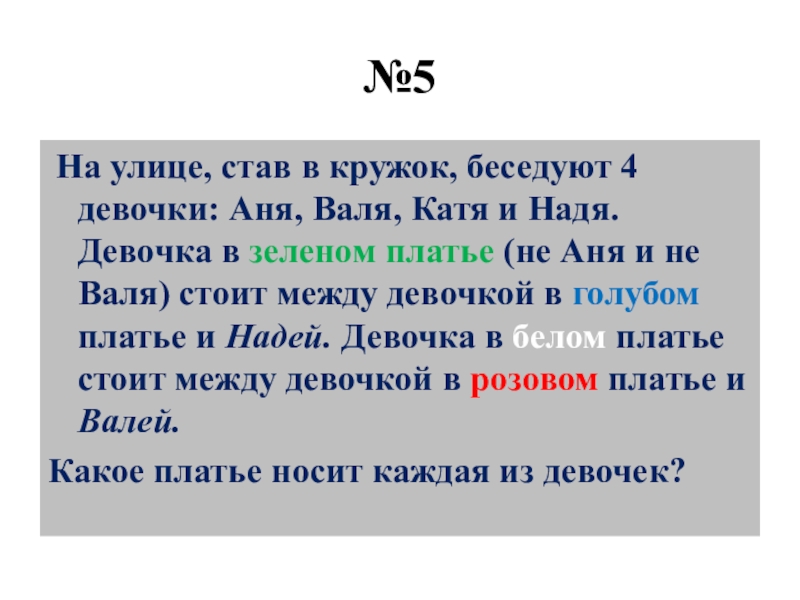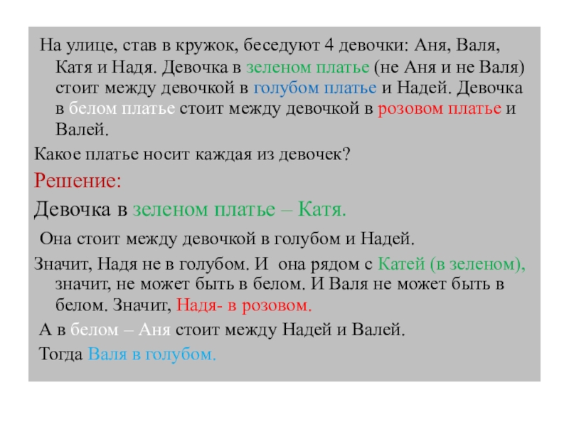 Значит, Надя не в голубом. И она рядом с Катей (в зеленом), значит, не может быть в белом. И Валя не может быть в белом. Значит, Надя- в розовом.