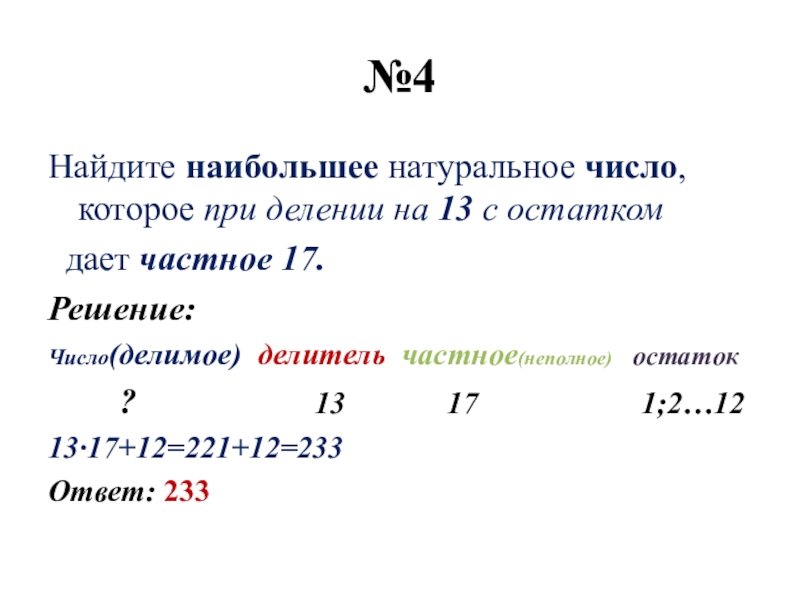 Найдите наибольшее натуральное число, которое при делении на 13 с остатком