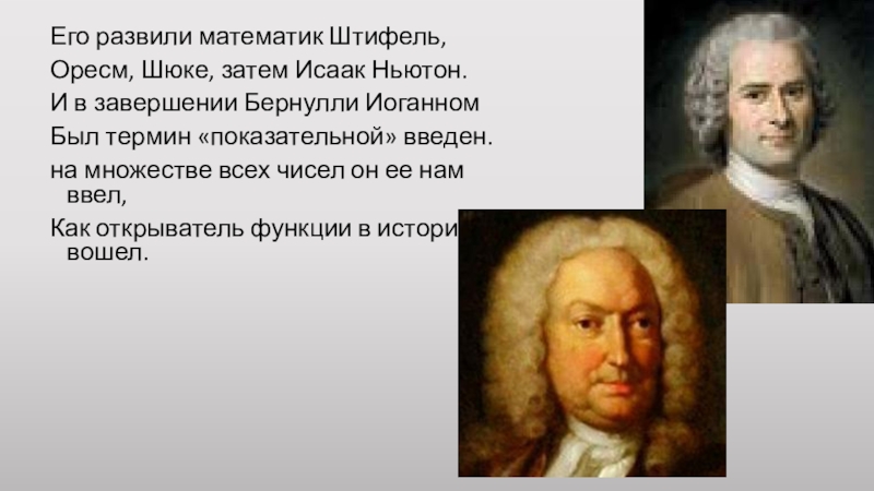 Его развили математик Штифель, Оресм, Шюке, затем Исаак Ньютон.И в завершении Бернулли ИоганномБыл термин «показательной» введен.на множестве
