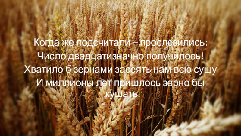 Когда же подсчитали – прослезились:Число двадцатизначно получилось!Хватило б зернами засеять нам всю сушуИ миллионы лет пришлось зерно