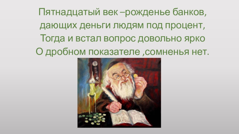 Пятнадцатый век –рожденье банков,дающих деньги людям под процент,Тогда и встал вопрос довольно ярко О дробном показателе ,сомненья